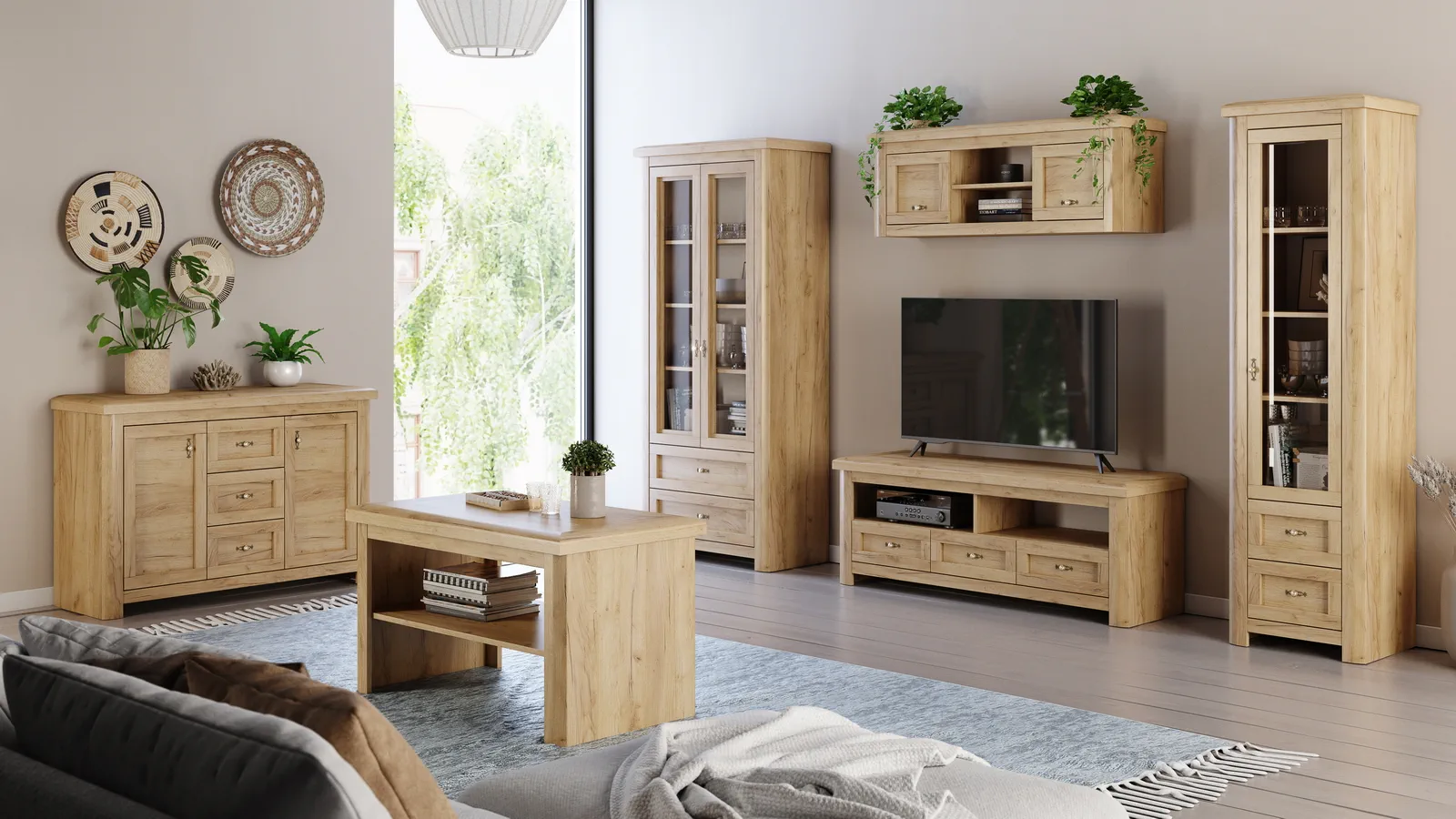 Pełna personalizacja: Skomponuj własne meblościanki z dostępnych elementów, takich jak witryny, komody, szafki RTV i półki wiszące. Nie musisz iść na kompromisy – teraz to meble dopasowują się do Ciebie, a nie na odwrót!