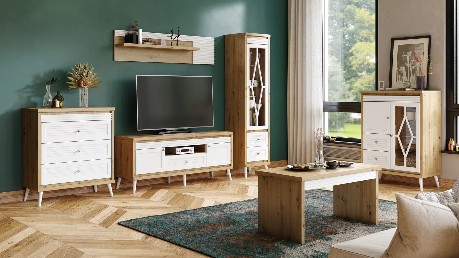 Pełna personalizacja: Skomponuj własne meblościanki z dostępnych elementów, takich jak witryny, komody, szafki RTV i półki wiszące. Nie musisz iść na kompromisy – teraz to meble dopasowują się do Ciebie, a nie na odwrót!