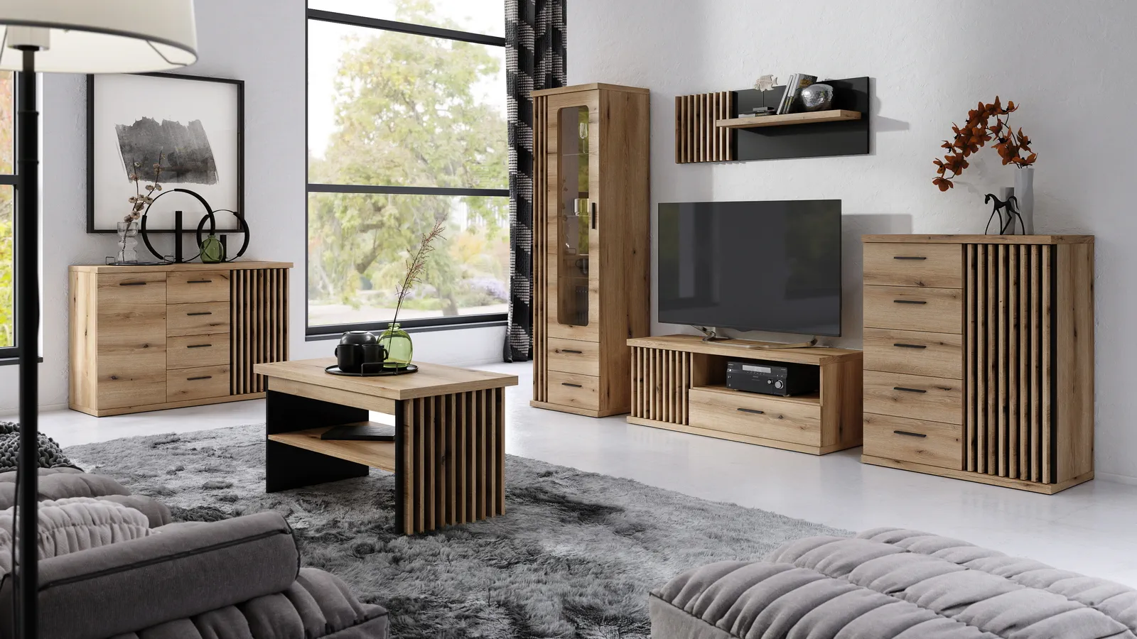 Pełna personalizacja: Skomponuj własne meblościanki z dostępnych elementów, takich jak witryny, komody, szafki RTV i półki wiszące. Nie musisz iść na kompromisy – teraz to meble dopasowują się do Ciebie, a nie na odwrót!
