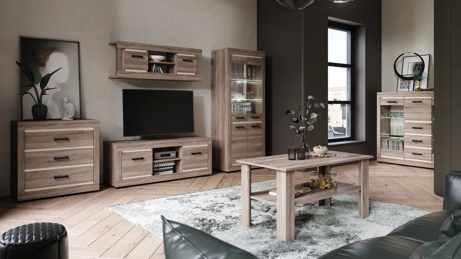 Pełna personalizacja: Skomponuj własne meblościanki z dostępnych elementów, takich jak witryny, komody, szafki RTV i półki wiszące. Nie musisz iść na kompromisy – teraz to meble dopasowują się do Ciebie, a nie na odwrót!